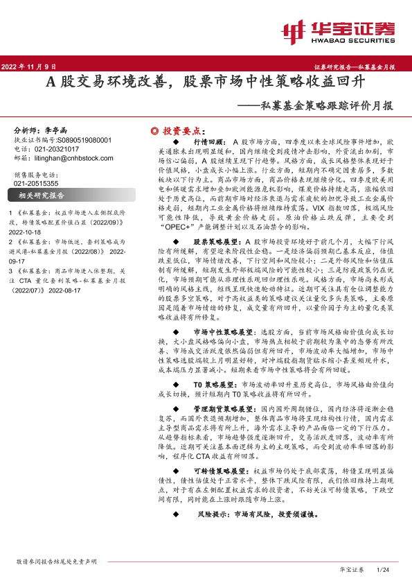 【华宝证券】【20221109】私募基金策略跟踪评价月报:A股交易环境改善,股票市场中性策略收益回升-24页
