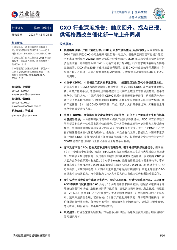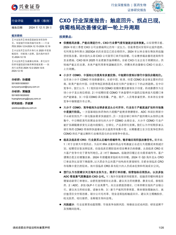 【兴业证券】【20241229】CXO行业深度报告:触底回升、拐点已现,供需格局改善催化新一轮上升周期-26页