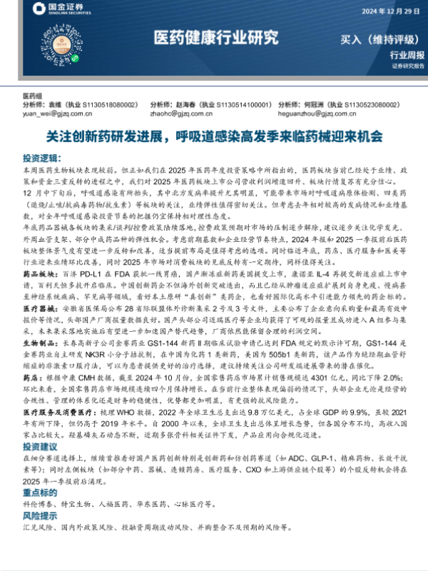 【国金证券】【20241229】医药健康行业研究:关注创新药研发进展,呼吸道感染高发季来临药械迎来机会-17页