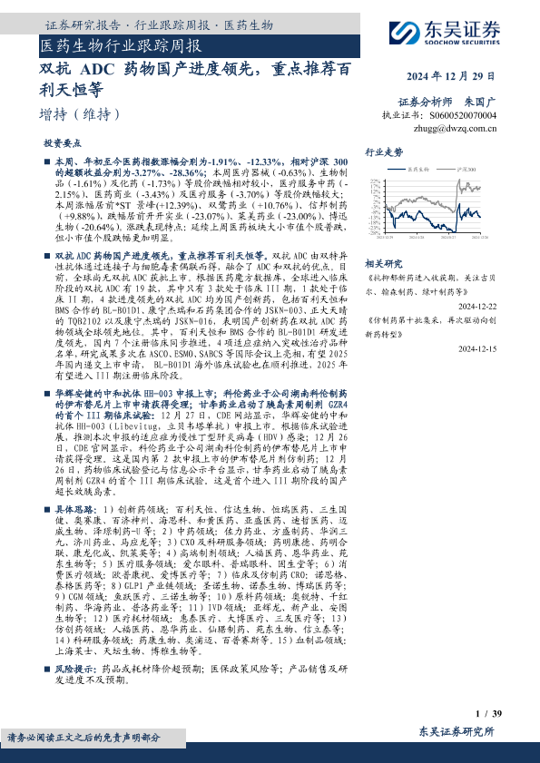 【东吴证券】【20241229】医药生物行业跟踪周报:双抗ADC药物国产进度领先-39页