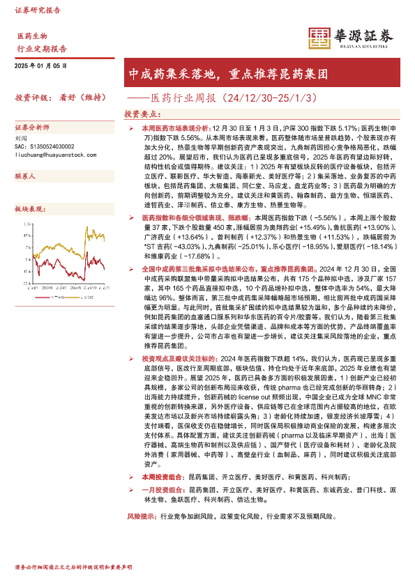 【华源证券】【20250105】中成药集采落地,重点推荐昆药集团-13页