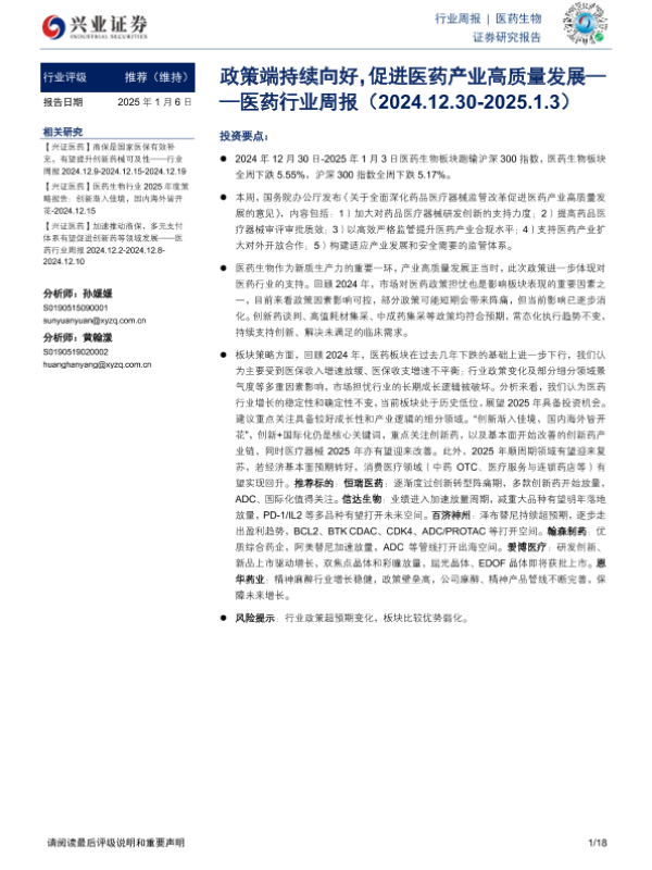 【兴业证券】【20250106】医药行业周报:政策端持续向好,促进医药产业高质量发展-18页