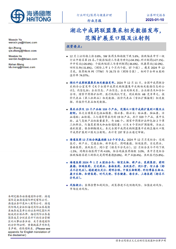 【海通国际】【20250110】医药与健康护理行业月报:湖北中成药联盟集采相关数据发布,范围扩展至口服及注射剂-12页