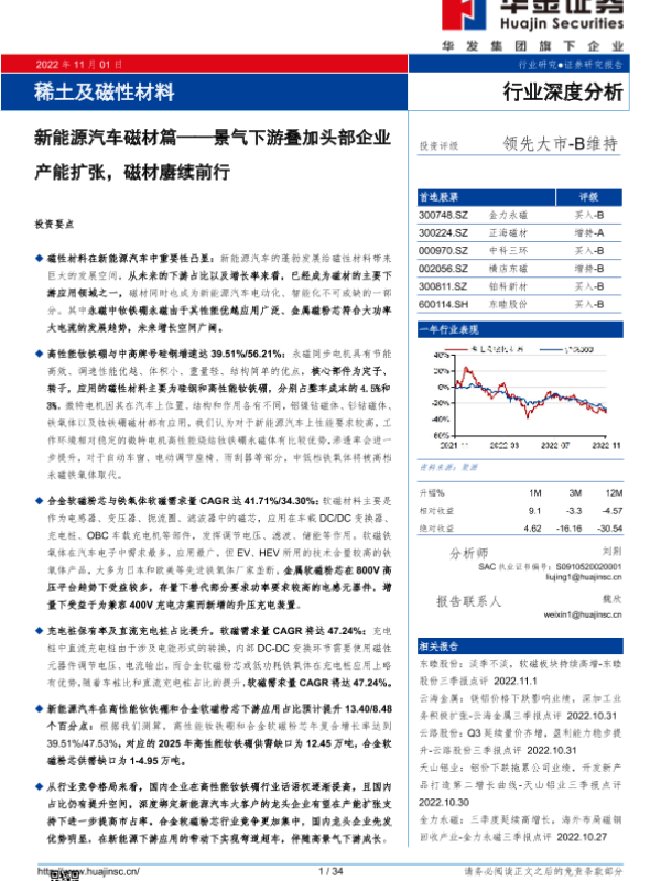 【华金证券】【20221101】稀土及磁性材料行业新能源汽车磁材篇:景气下游叠加头部企业产能扩张,磁材赓续前行-34页
