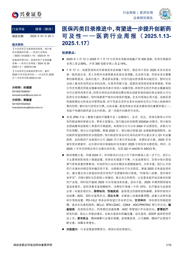 【兴业证券】【20250120】医药行业周报:医保丙类目录推进中,有望进一步提升创新药可及性-16页