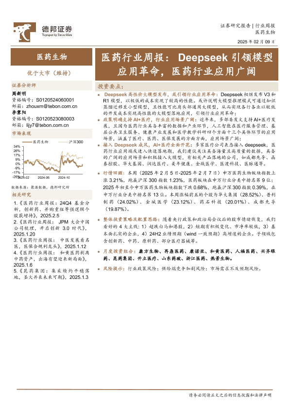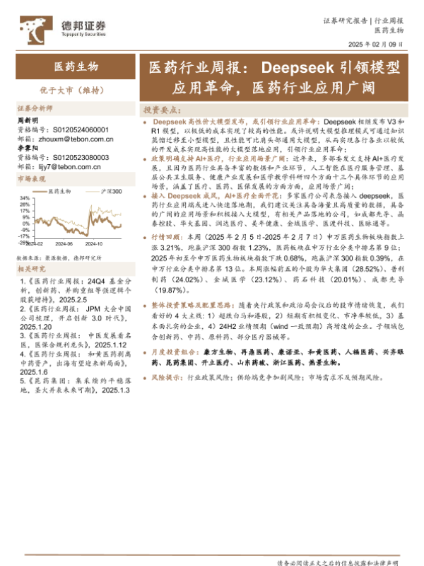【德邦证券】【20250209】医药行业周报:Deepseek引领模型应用革命,医药行业应用广阔-15页