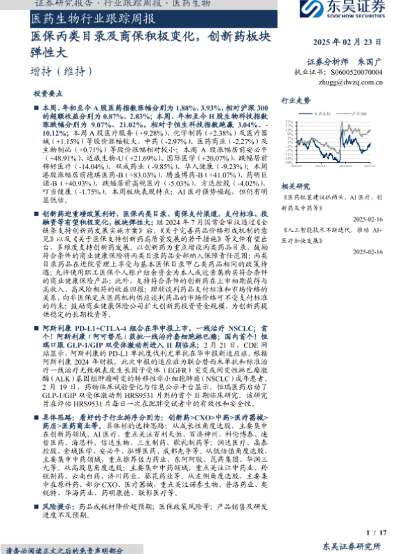 【东吴证券】【20250223】医药生物行业跟踪周报:医保丙类目录及商保积极变化,创新药板块弹性大-17页
