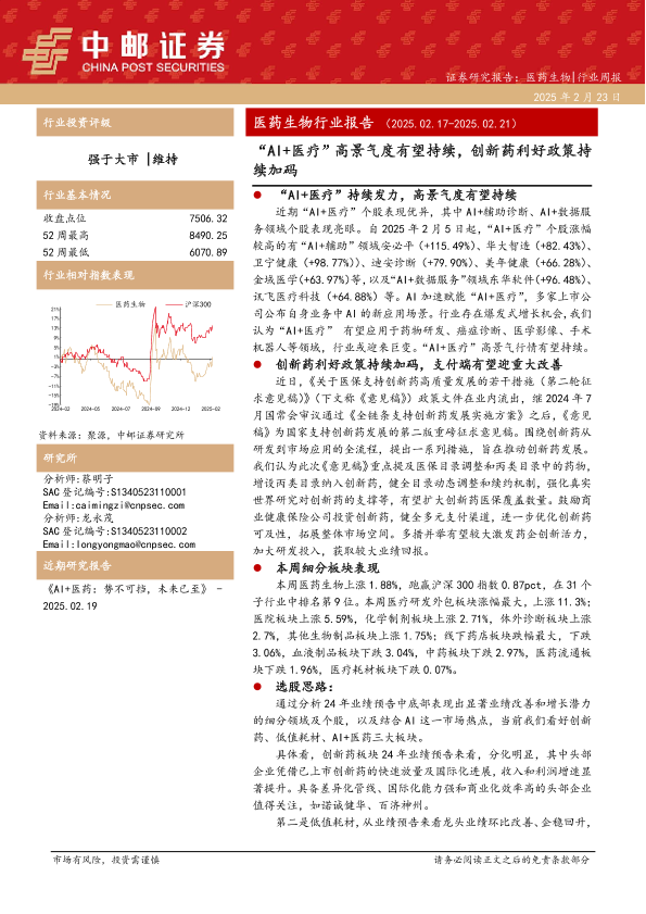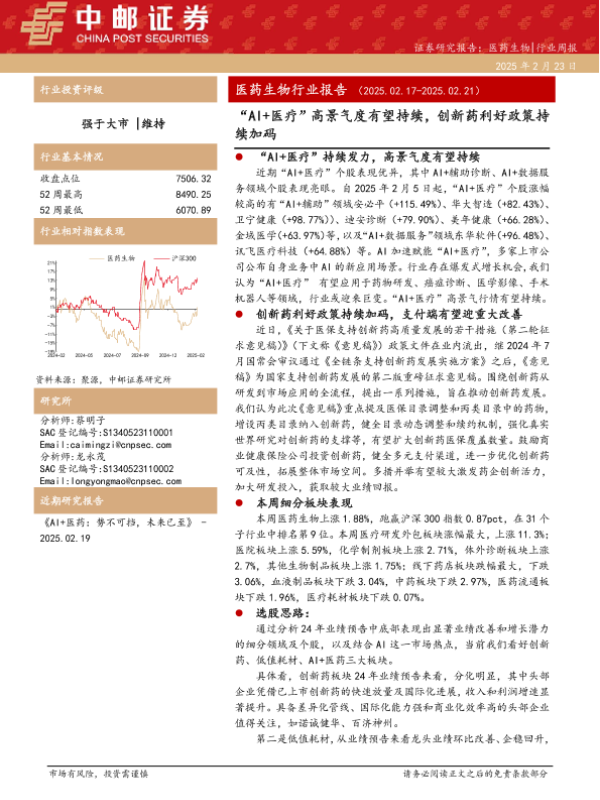 【中邮证券】【20250223】“AI+医疗”高景气度有望持续,创新药利好政策持续加码-21页