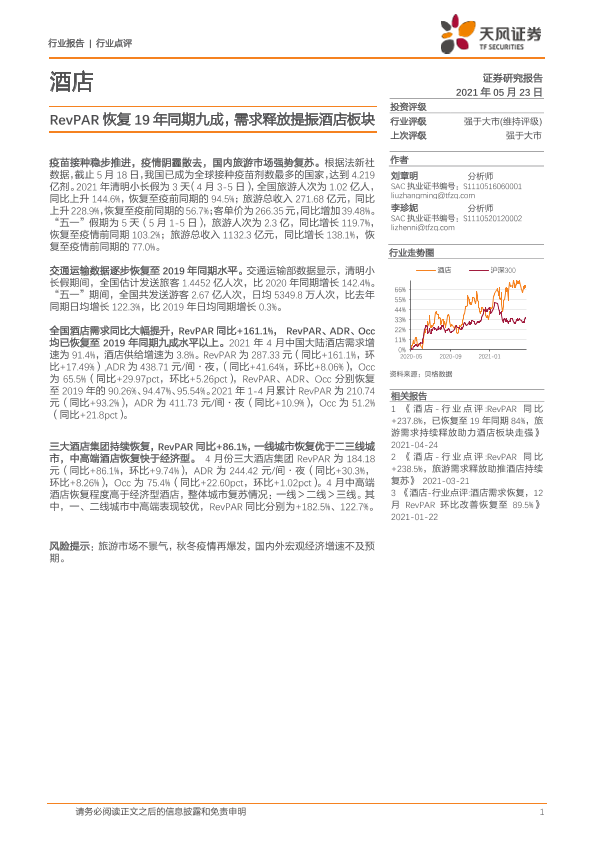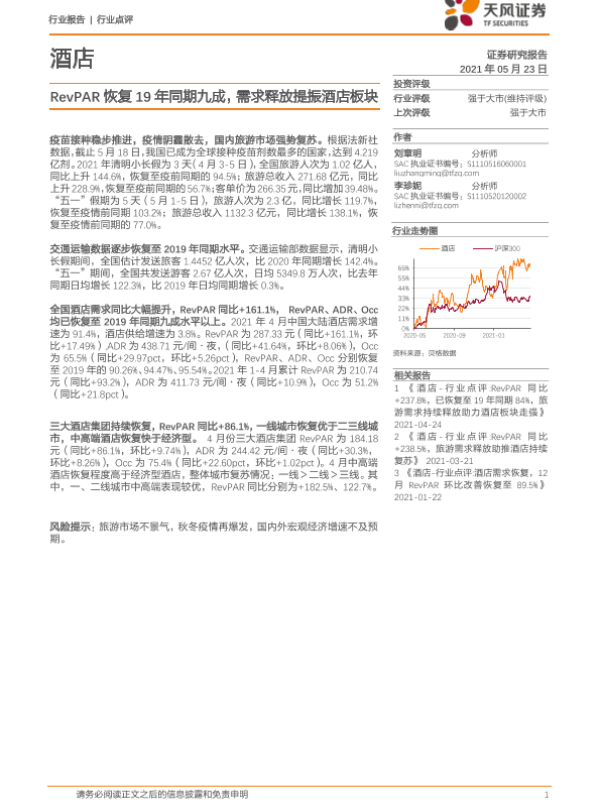 【天风证券】【20210523】酒店行业点评:RevPAR恢复19年同期九成,需求释放提振酒店板块-6页