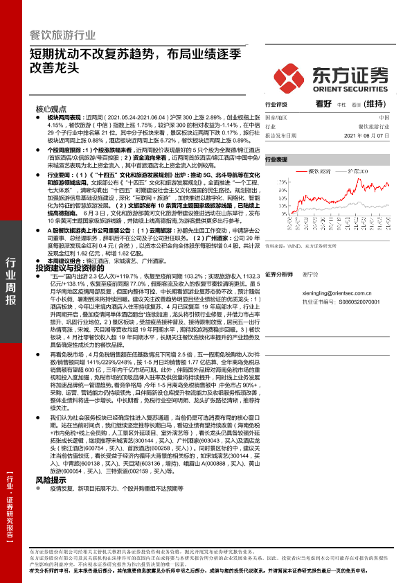 【东方证券】【20210607】餐饮旅游行业:短期扰动不改复苏趋势,布局业绩逐季改善龙头-13页