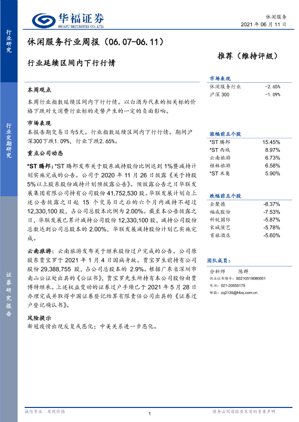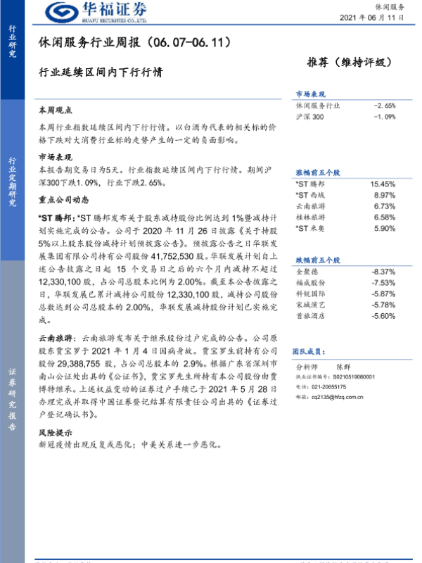 【华福证券】【20210611】休闲服务行业周报:行业延续区间内下行行情-5页