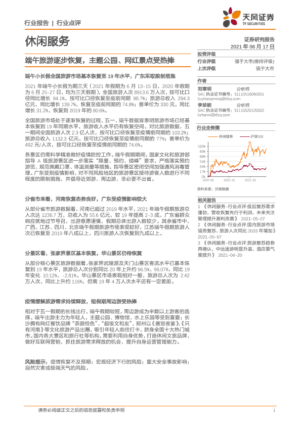 【天风证券】【20210617】休闲服务行业:端午旅游逐步恢复,主题公园、网红景点受热捧-4页