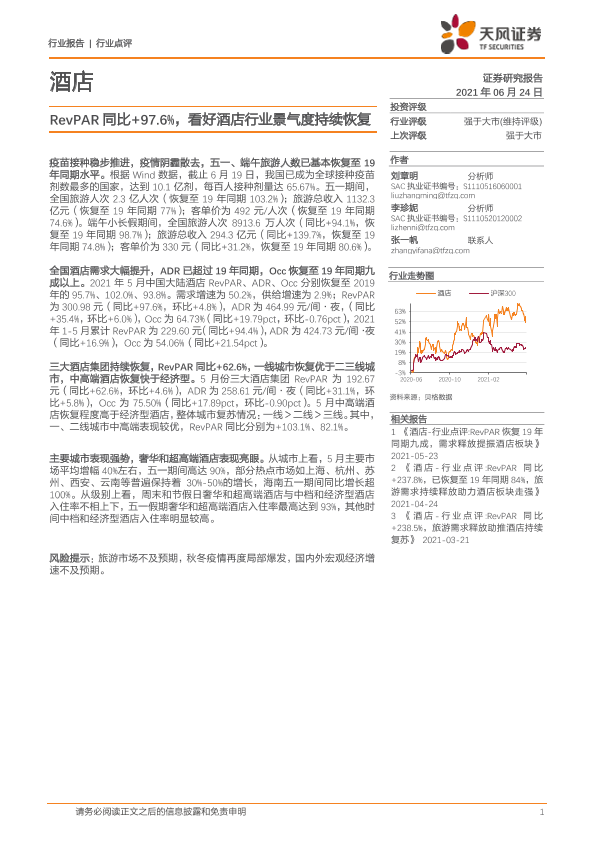【天风证券】【20210624】酒店:RevPAR同比+97.6%,看好酒店行业景气度持续恢复-6页