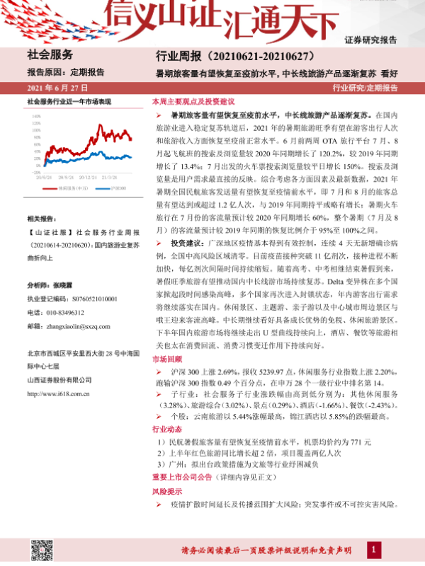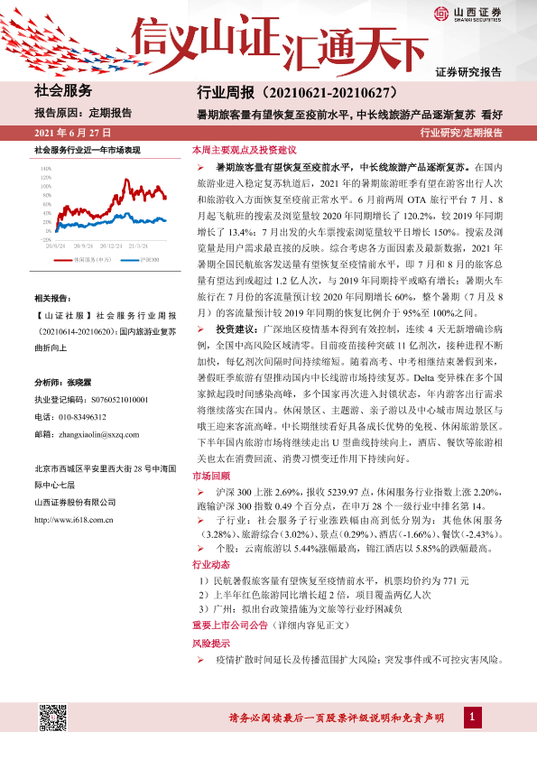 【山西证券】【20210627】社会服务行业周报:暑期旅客量有望恢复至疫前水平,中长线旅游产品逐渐复苏-9页