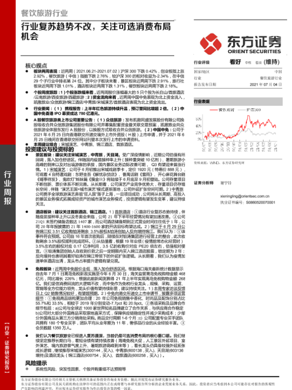 【东方证券】【20210704】餐饮旅游行业周报:行业复苏趋势不改,关注可选消费布局机会-13页