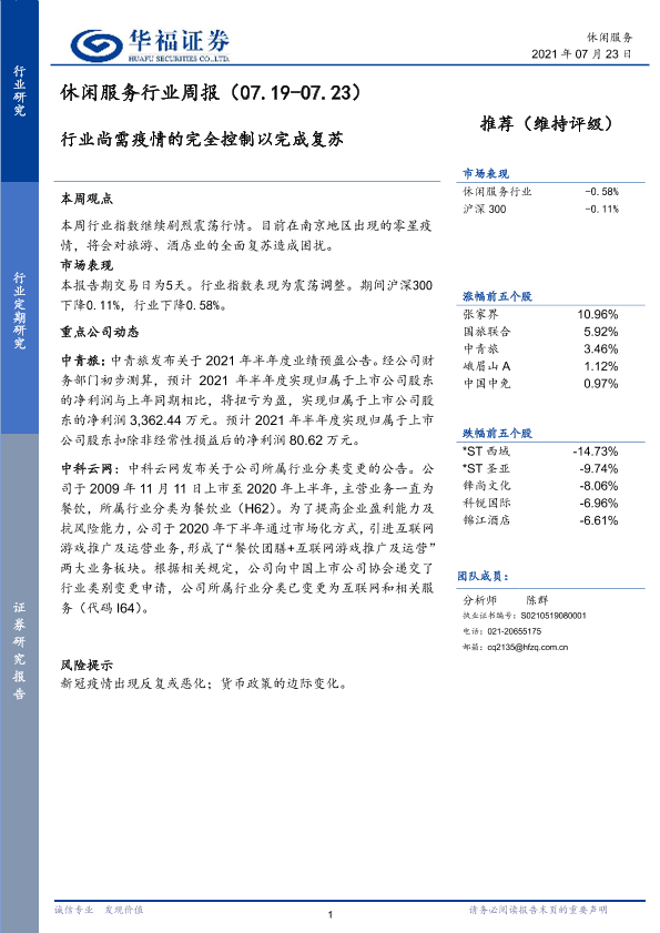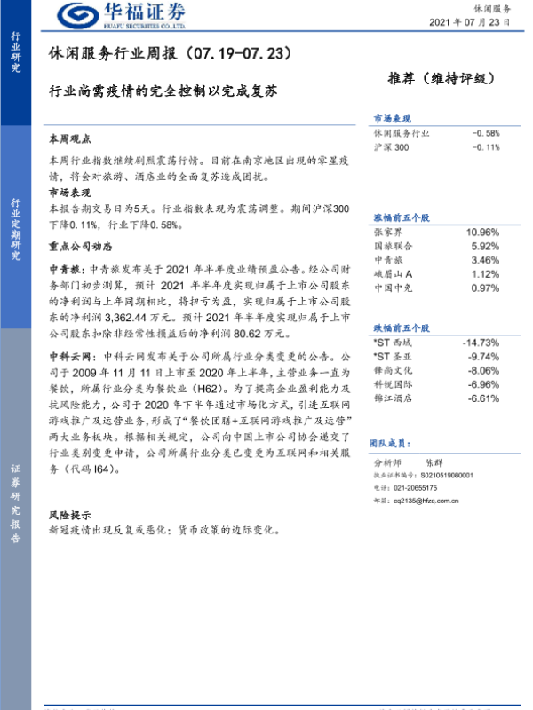 【华福证券】【20210723】休闲服务行业周报:行业尚需疫情的完全控制以完成复苏-5页