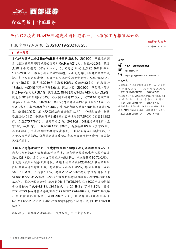 【西部证券】【20210725】社服零售行业周报:华住Q2境内RevPAR超疫情前同期水平,上海家化再推激励计划-12页