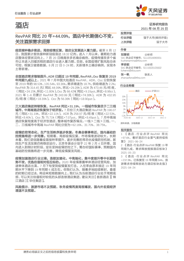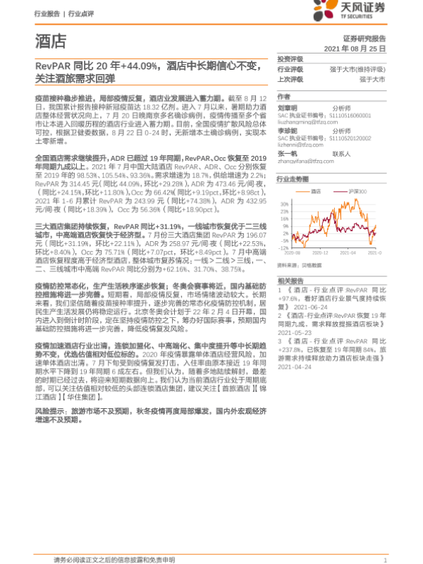 【天风证券】【20210825】酒店:RevPAR同比20年+44.09%,酒店中长期信心不变,关注酒旅需求回弹-6页