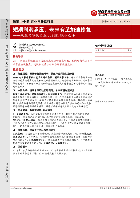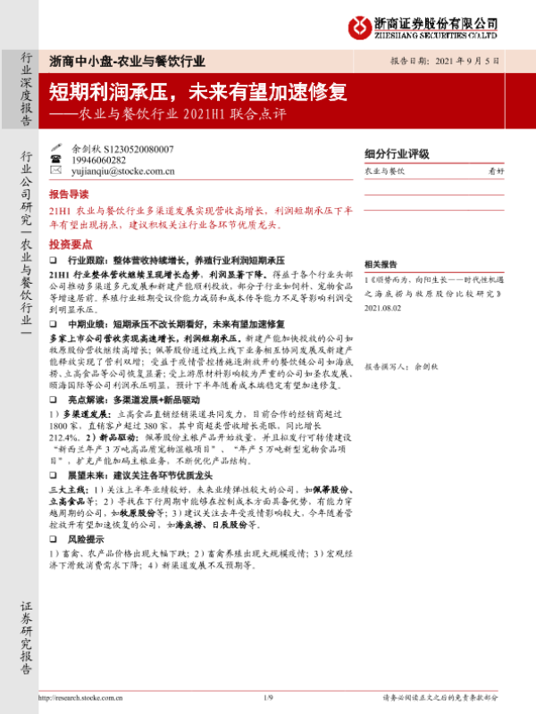 【浙商证券】【20210905】农业与餐饮行业2021H1联合点评:短期利润承压,未来有望加速修复-9页