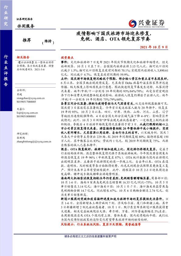 【兴业证券】【20211009】疫情影响下国庆旅游市场迎来修复,免税、酒店、OTA领先复苏节奏-7页