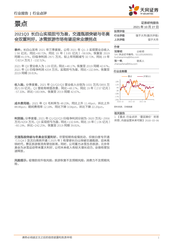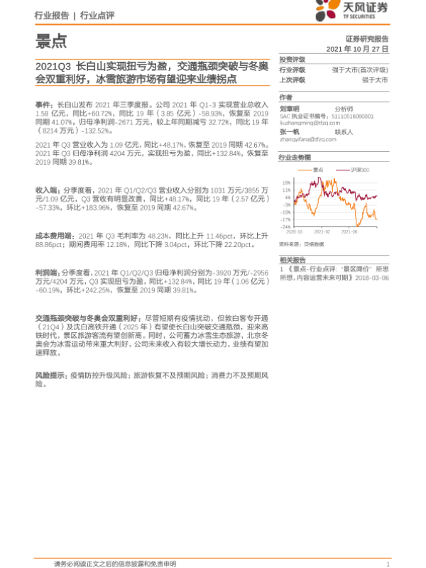【天风证券】【20211027】2021Q3长白山实现扭亏为盈,交通瓶颈突破与冬奥会双重利好,冰雪旅游市场有望迎来业绩拐点-2页