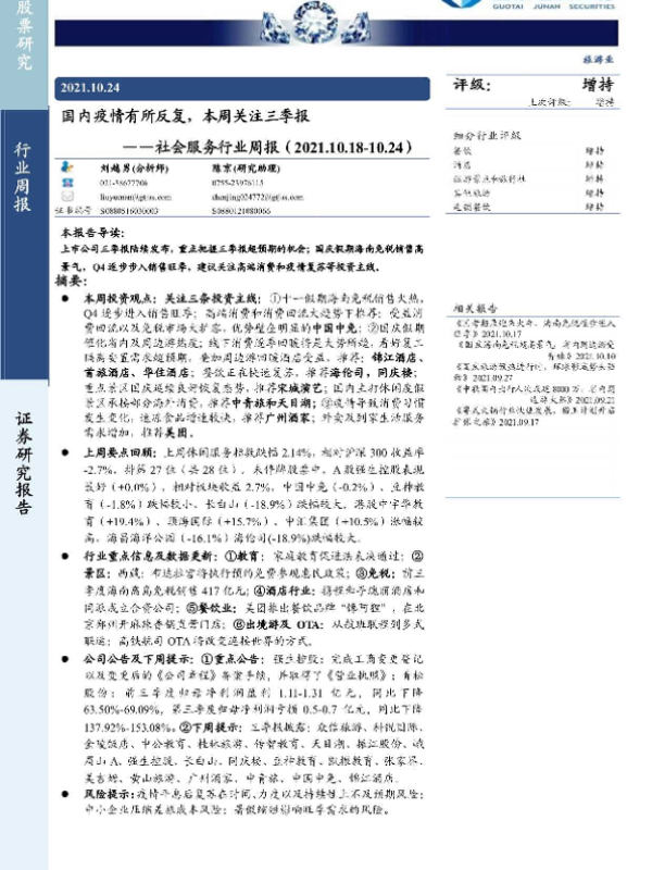 三季报 免税销售 消费趋势 疫情复苏 社会服务