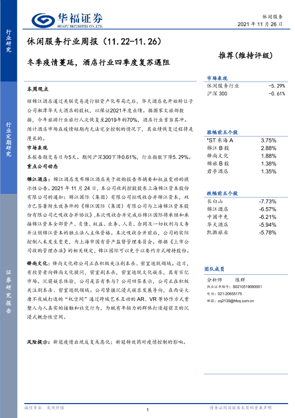 【华福证券】【20211126】休闲服务行业周报:冬季疫情蔓延,酒店行业四季度复苏遇阻-5页