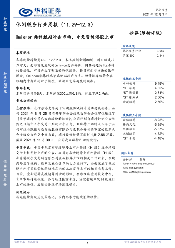 【华福证券】【20211203】休闲服务行业周报:Omicron毒株短期冲击市场,中免暂缓港股上市-5页