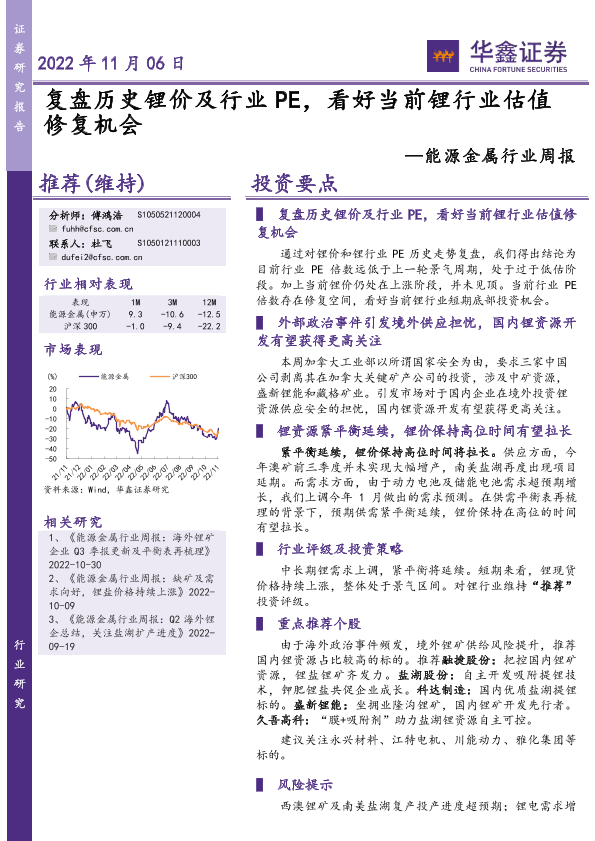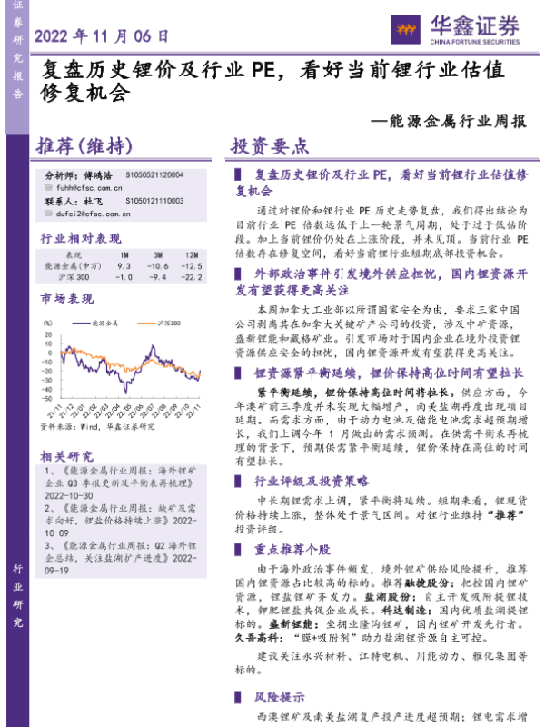 【华鑫证券】【20221106】能源金属行业周报:复盘历史锂价及行业PE,看好当前锂行业估值修复机会-21页