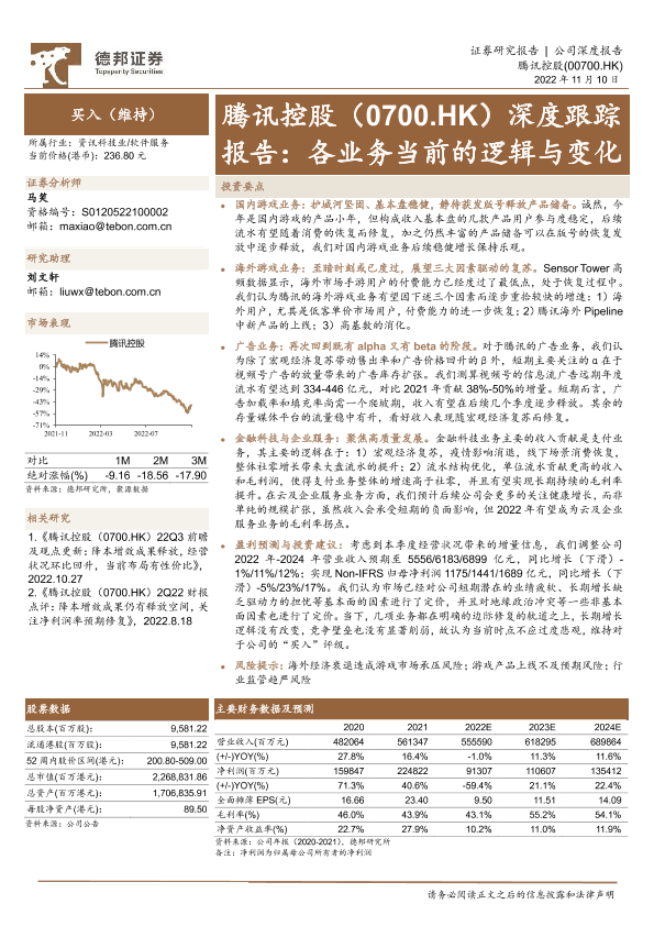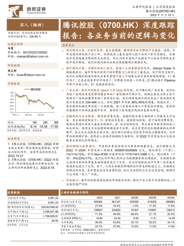 【德邦证券】【20221110】腾讯控股:深度跟踪报告:各业务当前的逻辑与变化-20页