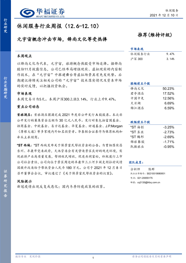【华福证券】【20211210】休闲服务行业周报:元宇宙概念冲击市场,锋尚文化等受热捧-5页