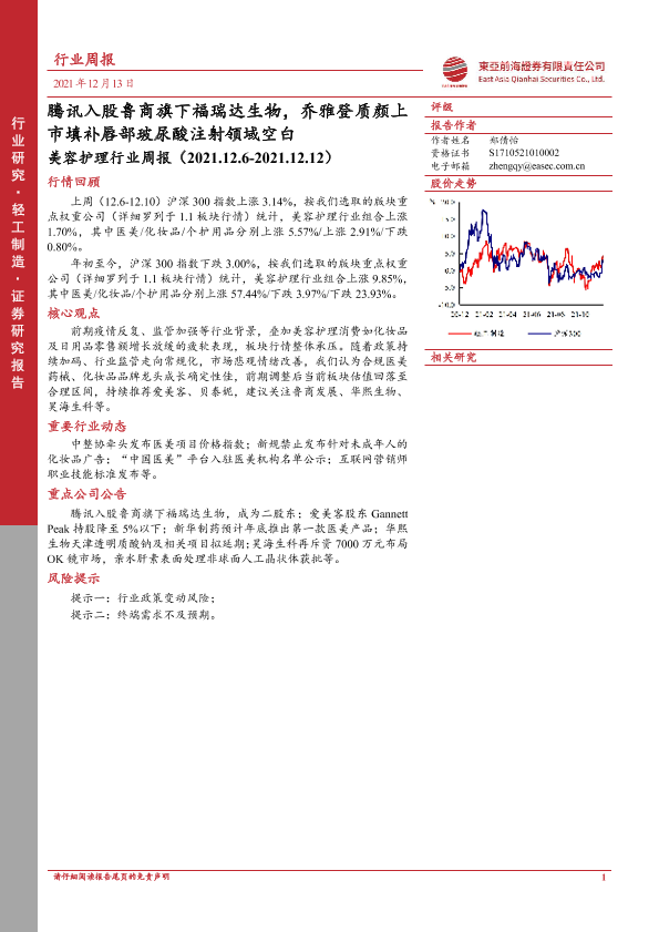 【东亚前海证券】【20211213】美容护理行业周报:腾讯入股鲁商旗下福瑞达生物,乔雅登质颜上市填补唇部玻尿酸注射领域空白-10页