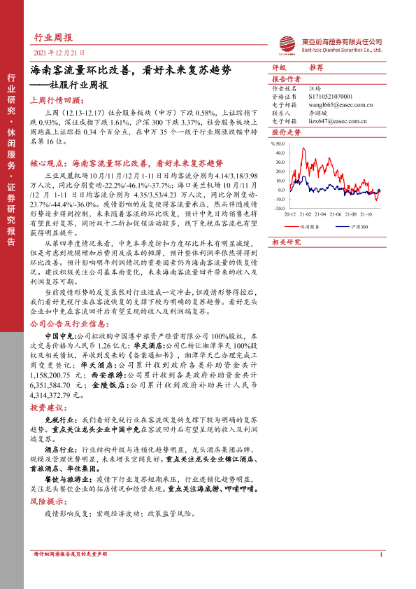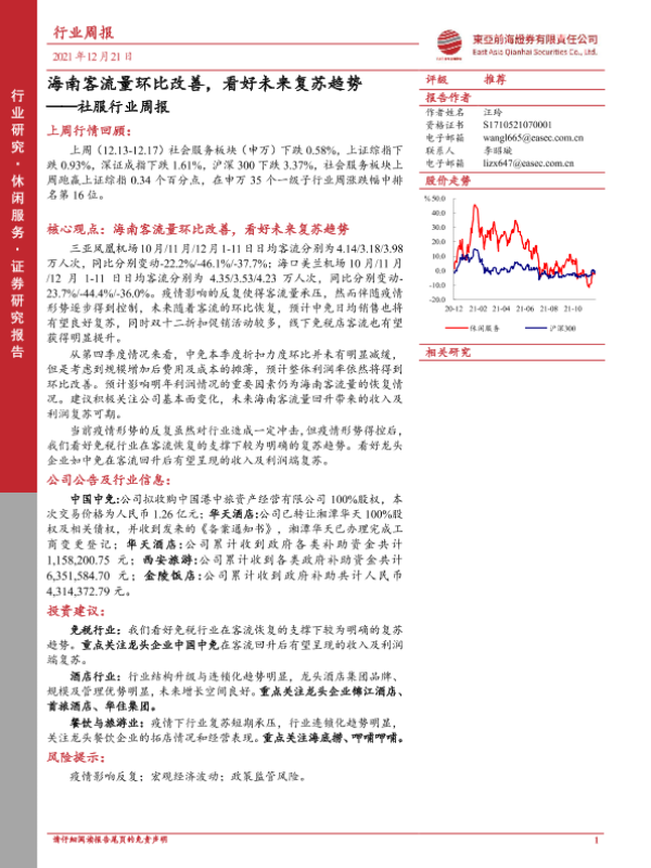 【东亚前海证券】【20211221】社服行业周报:海南客流量环比改善,看好未来复苏趋势-15页