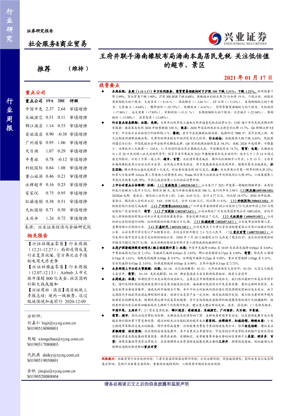 【兴业证券】【20210117】社会服务&商业贸易行业周报:王府井联手海南橡胶布局海南本岛居民免税-20页