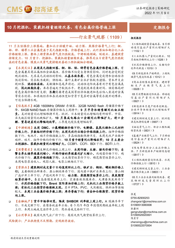 【海通证券】【20221109】行业景气观察:10月挖掘机、装载机销量继续改善,有色金属价格普遍上涨-30页