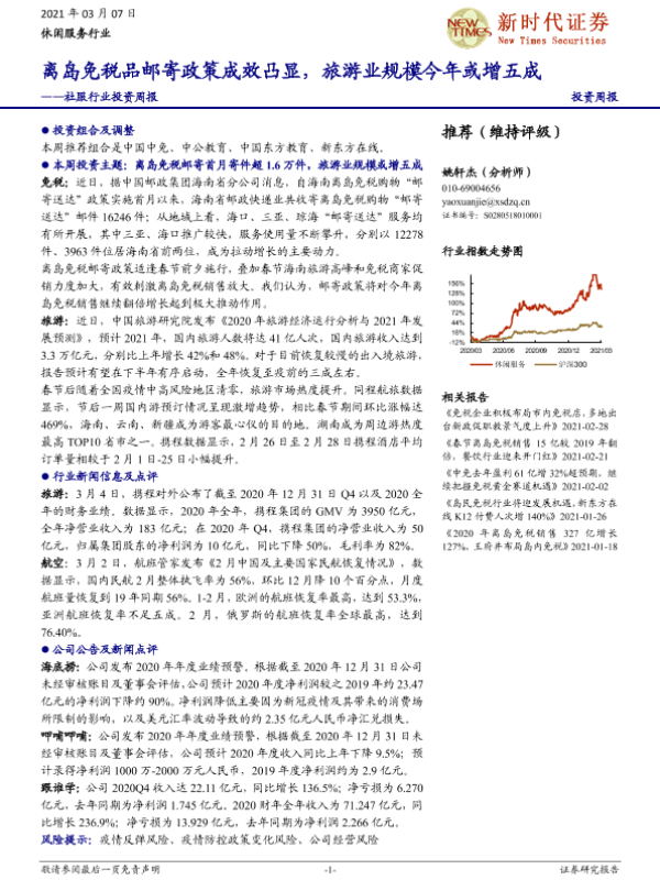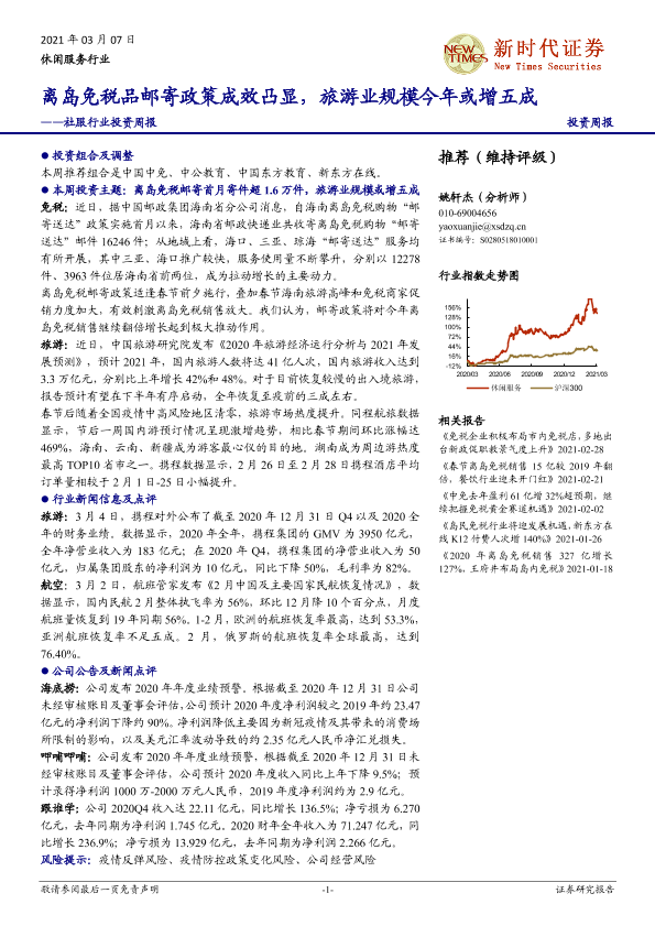 【新时代证券】【20210307】社服行业投资周报:离岛免税品邮寄政策成效凸显,旅游业规模今年或增五成-15页