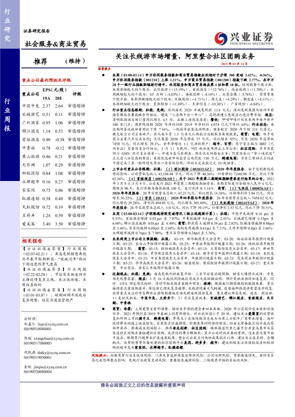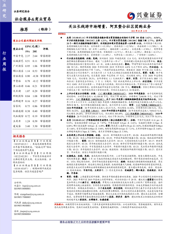 【兴业证券】【20210314】社会服务&商业贸易行业周报:关注长线游市场增量,阿里整合社区团购业务-19页