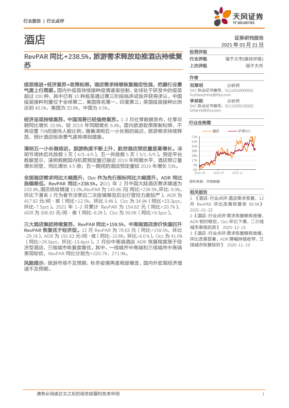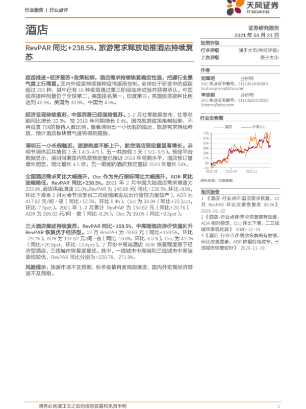 【天风证券】【20210321】酒店行业:RevPAR同比+238.5%,旅游需求释放助推酒店持续复苏-6页