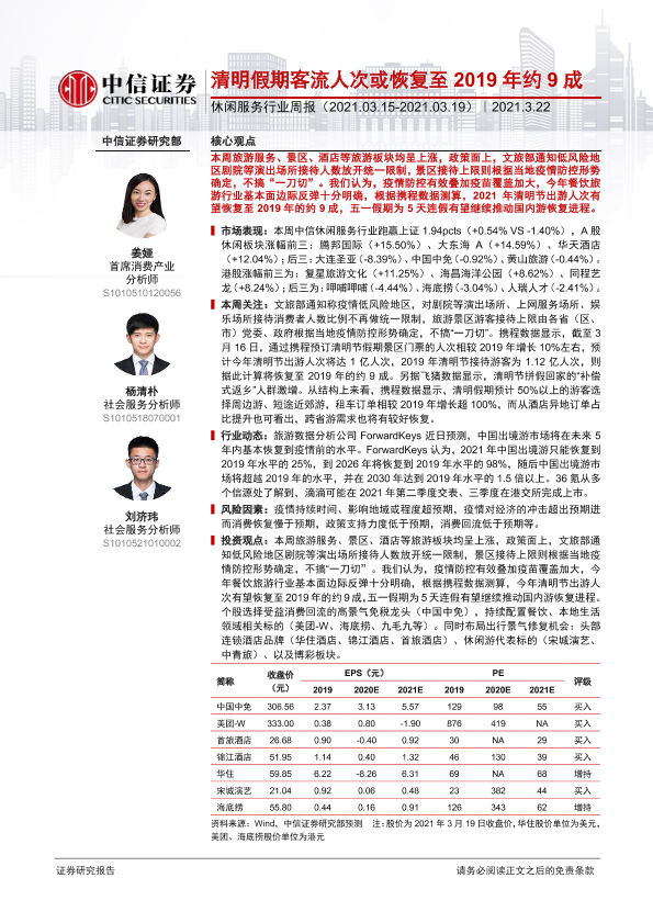 【中信证券】【20210322】休闲服务行业周报:清明假期客流人次或恢复至2019年约9成-13页