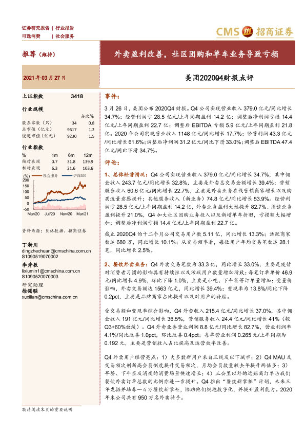 【海通证券】【20210327】美团2020Q4财报点评:外卖盈利改善,社区团购和单车业务导致亏损-5页