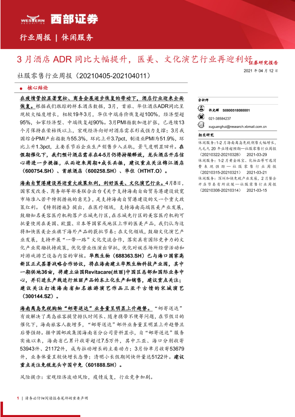 【西部证券】【20210412】3月酒店ADR同比大幅提升,医美、文化演艺行业再迎利好-11页