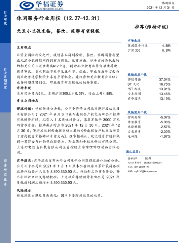 【华福证券】【20211231】休闲服务行业周报:元旦小长假来临,餐饮、旅游有望提振-5页