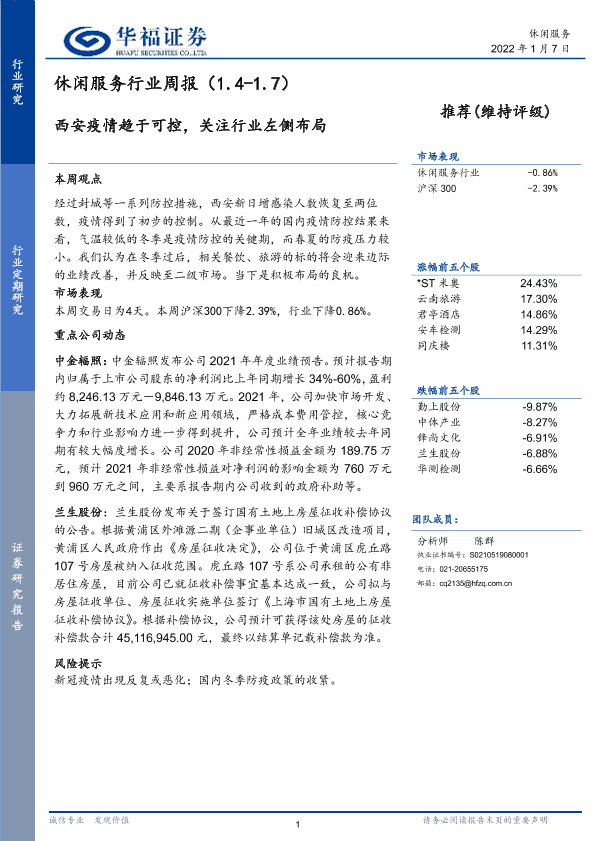 【华福证券】【20220107】休闲服务行业周报:西安疫情趋于可控,关注行业左侧布局-5页