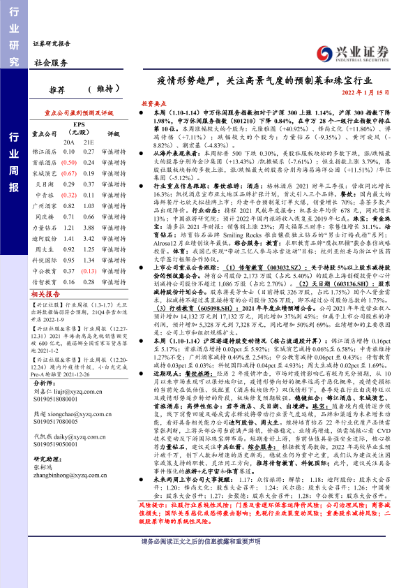 【兴业证券】【20220115】社会服务行业周报:疫情形势趋严,关注高景气度的预制菜和珠宝行业-15页