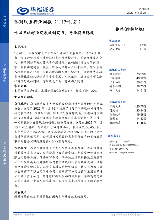 【华福证券】【20220121】休闲服务行业周报:十四五旅游业发展规划发布,行业拐点隐现-5页
