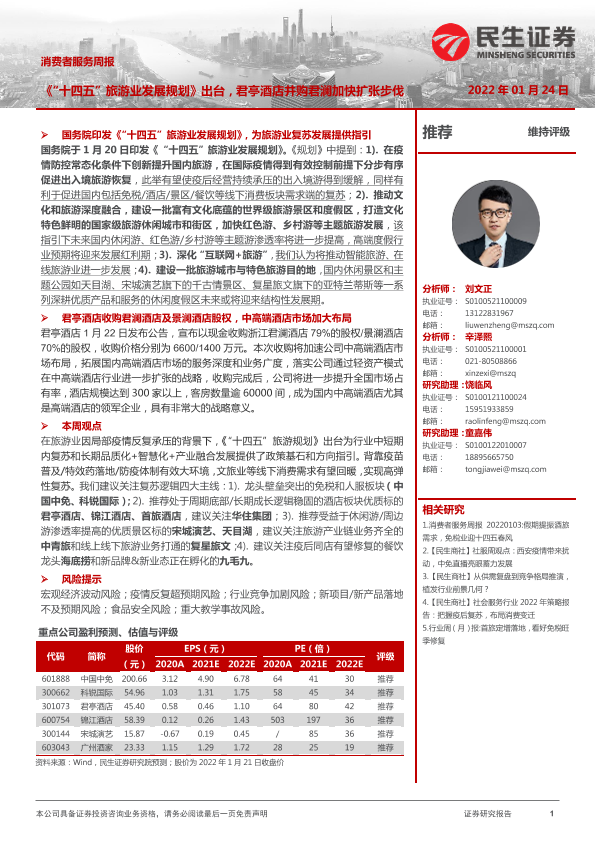 【民生证券】【20220124】消费者服务周报:《“十四五”旅游业发展规划》出台,君亭酒店并购君澜加快扩张步伐-36页