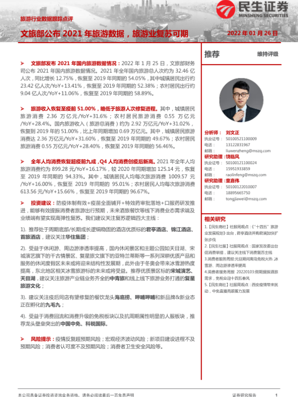【民生证券】【20220126】旅游行业数据跟踪点评:文旅部公布2021年旅游数据,旅游业复苏可期-13页
