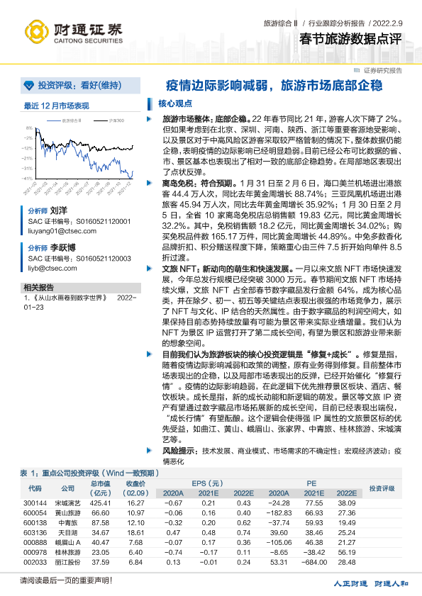 【财通证券】【20220209】春节旅游数据点评:疫情边际影响减弱,旅游市场底部企稳-29页