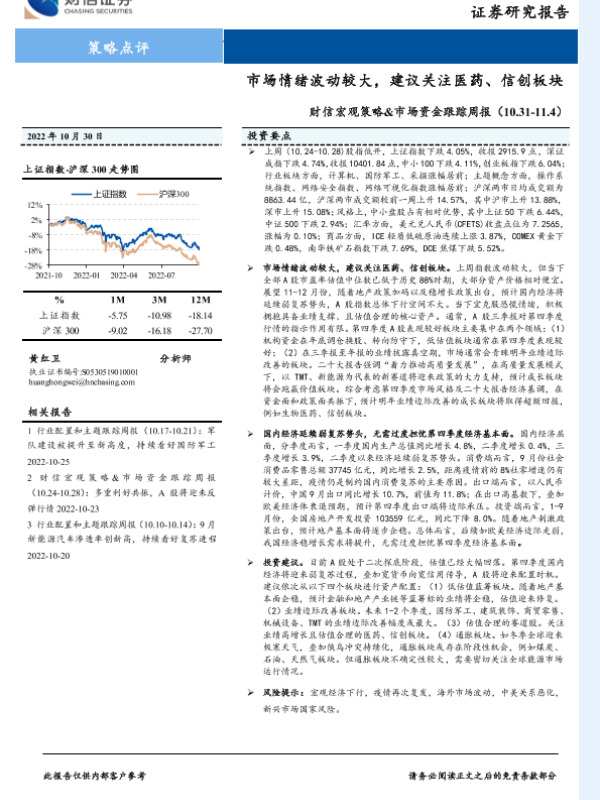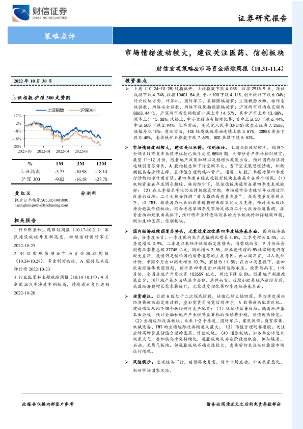【财信证券】【20221030】财信宏观策略&市场资金跟踪周报:市场情绪波动较大,建议关注医药、信创板块-18页