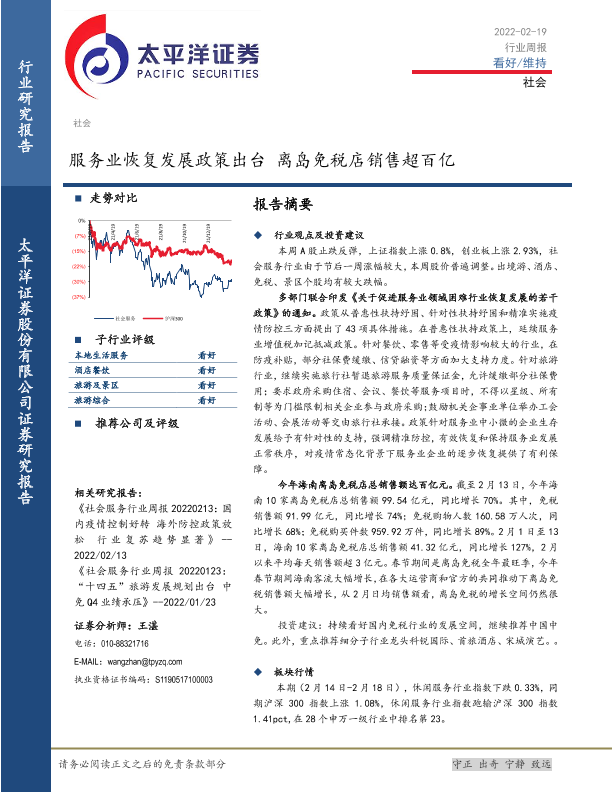 【太平洋证券】【20220219】社会行业周报:服务业恢复发展政策出台 离岛免税店销售超百亿-12页
